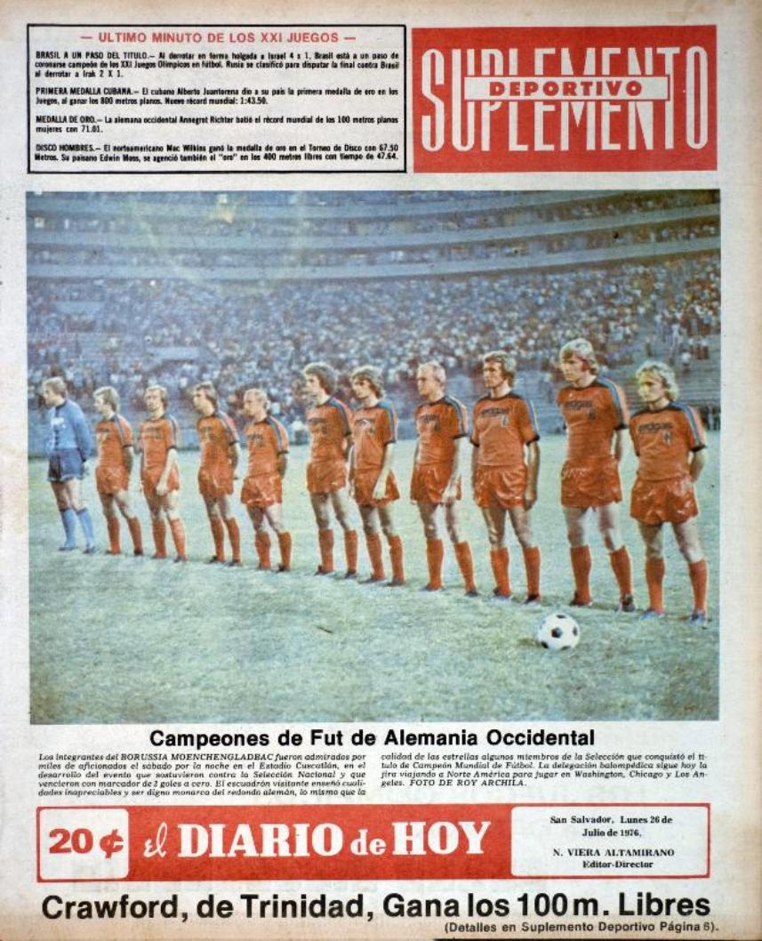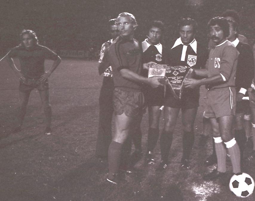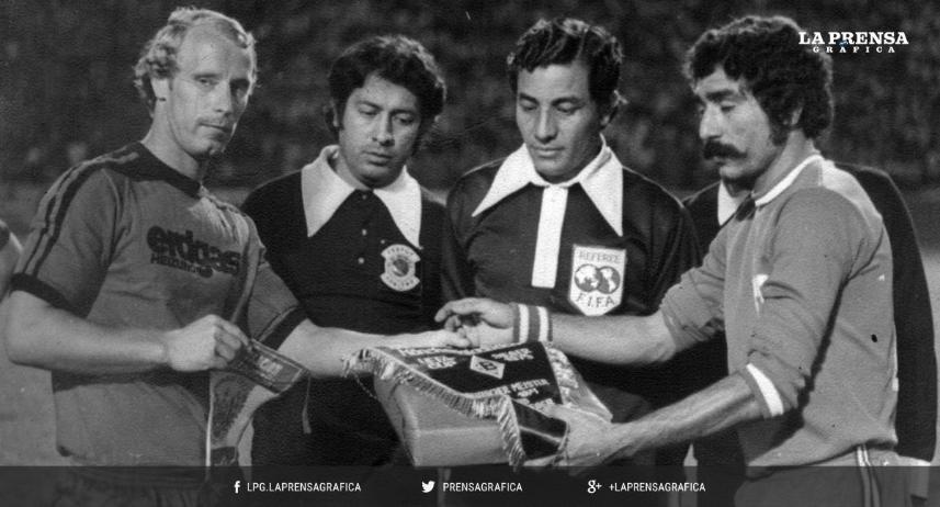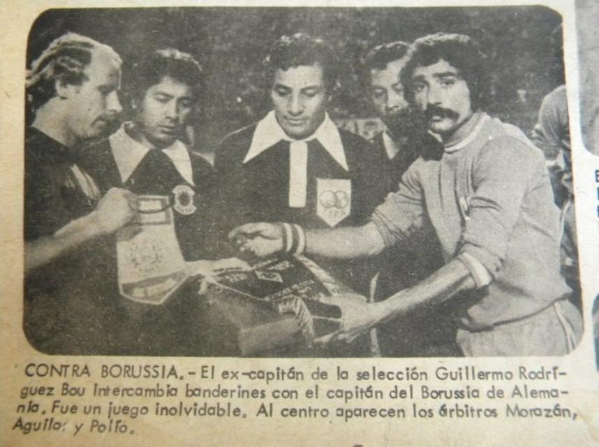 | El danes Allan Simonsen, el internacional Berti Vogts (capitan) intercambiando banderines con Guillermo Rodriguez Bou antes del juego. |