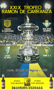 | El Trofeo Ramon de Carranza es una cuadrangular internacional con la siempre participacion de Cadiz F.C. y tres equipos en los cuales pueden ser extranjeros o nacionales. El Trofeo se juega cada an`o en el estadio de Cadiz. Jorge "Magico" Gonzalez jugo en 7 cuadrangulares: 1982, 1983, 1984, 1987, 1988, 1989 y 1990. Jugo 14 juegos. Entre ellos contra equipos como Levski Sofia de Bulgaria, Nacional de Uruguay, Vasco Da Gama de Brasil, Pen`arol de Uruguay y Santos de Brasil. En adicion contra Real Sociedad, Real Betis, Atletico Bilbao, Barcelona y Atletico de Madrid. Fue campeon en 1983. |